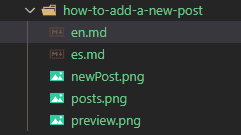If we have already decided the name of the post, we can create the file with the content, in our case content/blog/how-to-add-a-new-post/en.md